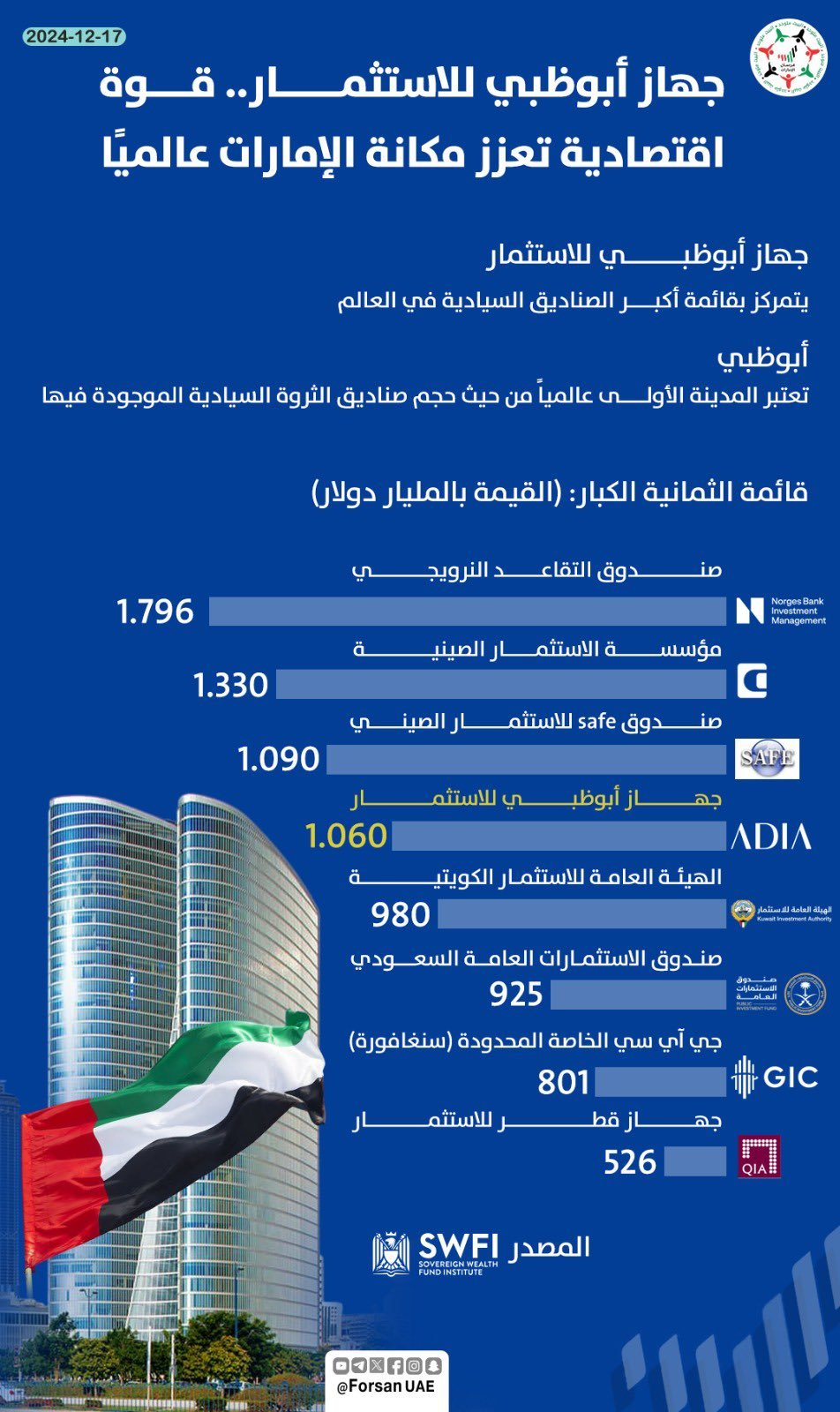 تُواصل دولة الإمارات العربية المتحدة تحقيق إنجازات اقتصادية تُرسخ مكانتها العالمية، حيث سجّل جهاز أبوظبي للاستثمار أصولًا تُقدّر بـ 1.06 تريليون دولار أمريكي، ليكون بذلك الممثل الوحيد عن منطقة الشرق الأوسط وشمال إفريقيا ضمن نادي صناديق الثروة السيادية العالمية التي تتجاوز قيمة أصولها المدارة حاجز التريليون دولار.